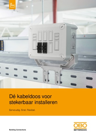 Met de stekerbare kabeldozen van OBO kunnen elektrische verbindingen efficiënt en flexibel worden aangelegd. Dit zorgt voor een aanzienlijke tijdsbesparing bij de installatie. De kabeldozen zijn verkrijgbaar in combinatie met de verschillende varianten van de stekerbare deksels. Hierdoor kan moeiteloos aan de uitgebreide installatie-eisen van hedendaagse bouwprojecten worden voldaan. Het assortiment wordt compleet gemaakt met een uitgebreide reeks toebehoren, zoals het variabele bevestigingselement voor kabelgoten.