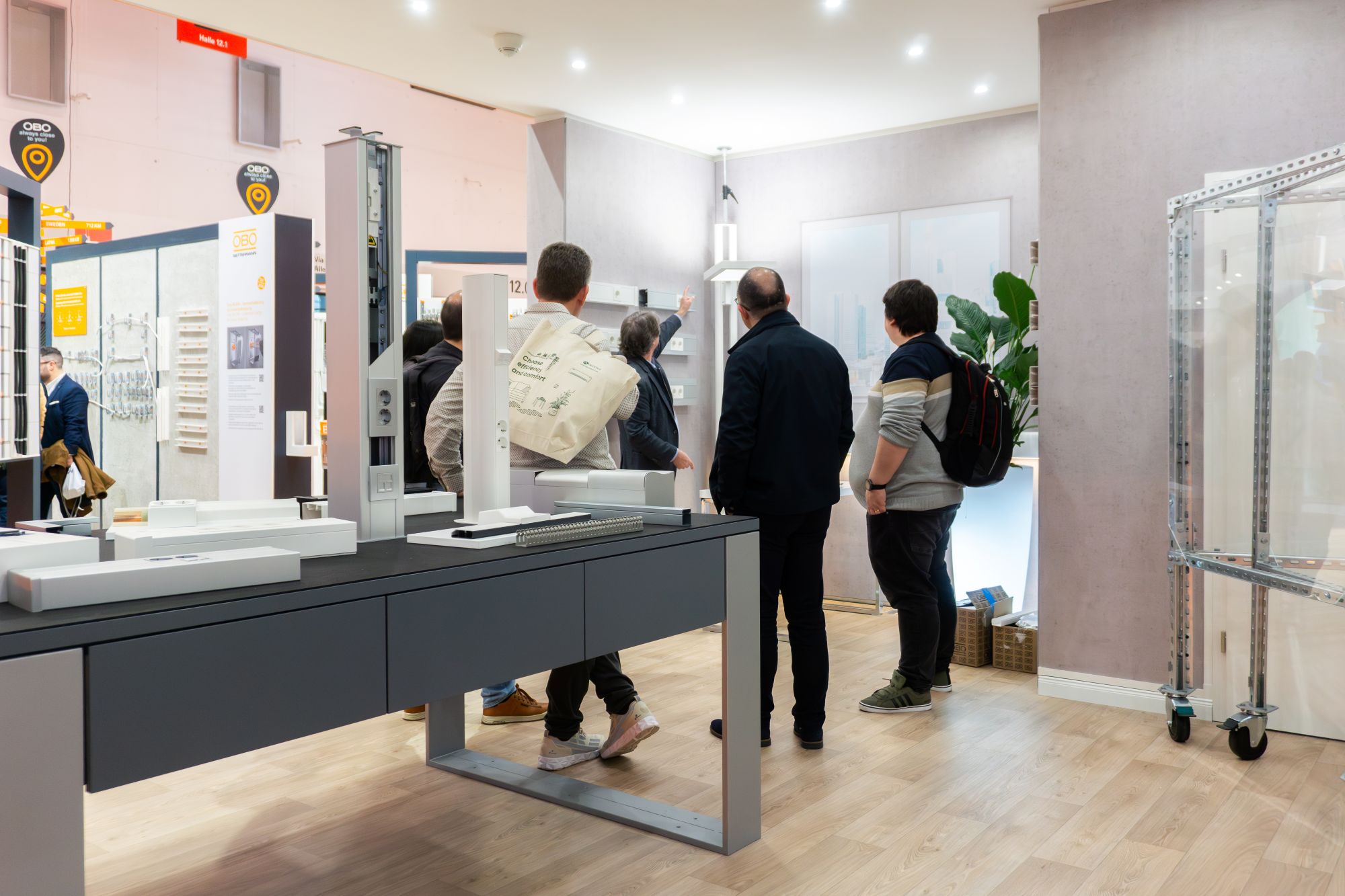 Click your way through the OBO exhibition stand, just like on Google Street View. You’ll come across red dots at the individual stations. Just click on one to open further information about the relevant product or focus topic.