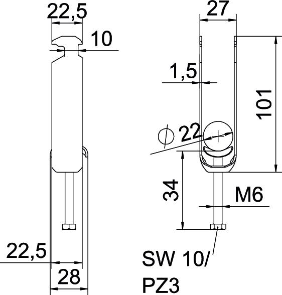 ProductbeschrijvingBeugelklem met hamerkopvoet, metalen drukwand met afgeronde randen voor kabelbescherming. Voor verticale en horizontale montage van 3 enkele kabels op C-profielrail. Voor sleufbreedte 16 - 17 mm. Met 1 schroef op drukwand, universele zeskantschroefkop SW10, met gleuf en kruiskop. Geschikt voor de montage binnen en buiten. Meerdere kabels moeten door dubbele wanden worden gescheiden. Toepassing van de drukwand wordt geadviseerd.