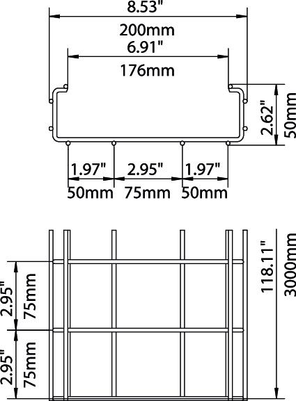 ProductbeschrijvingDraadgoot in C-vorm van gepuntlaste staaldraden met een zijhoogte van 50 mm.