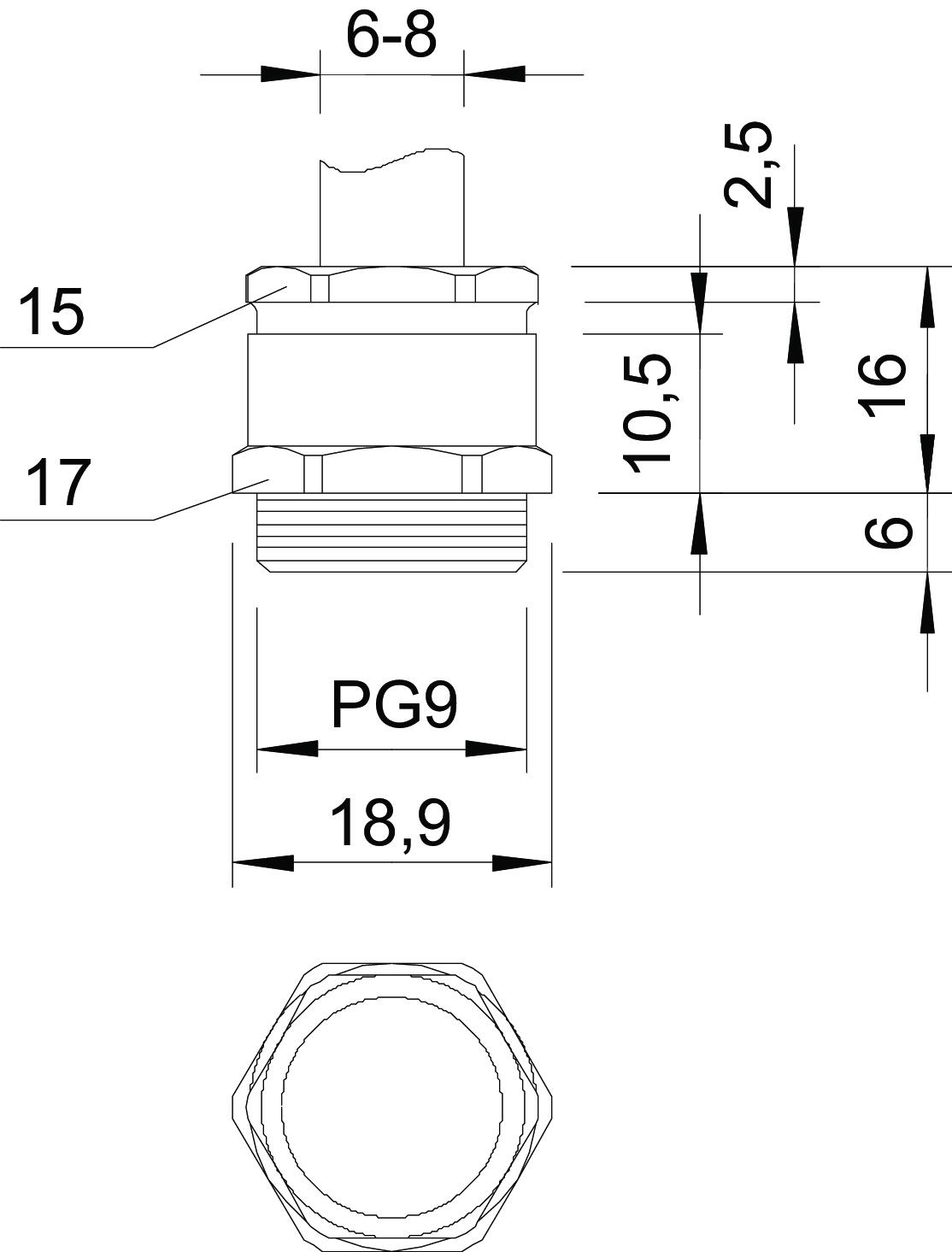 ProductbeschrijvingKabelschroefverbinding met zeskant-tussenstuk, vorm C4 volgens DIN 46320 met Pg-aansluitdraad volgens DIN 40430.