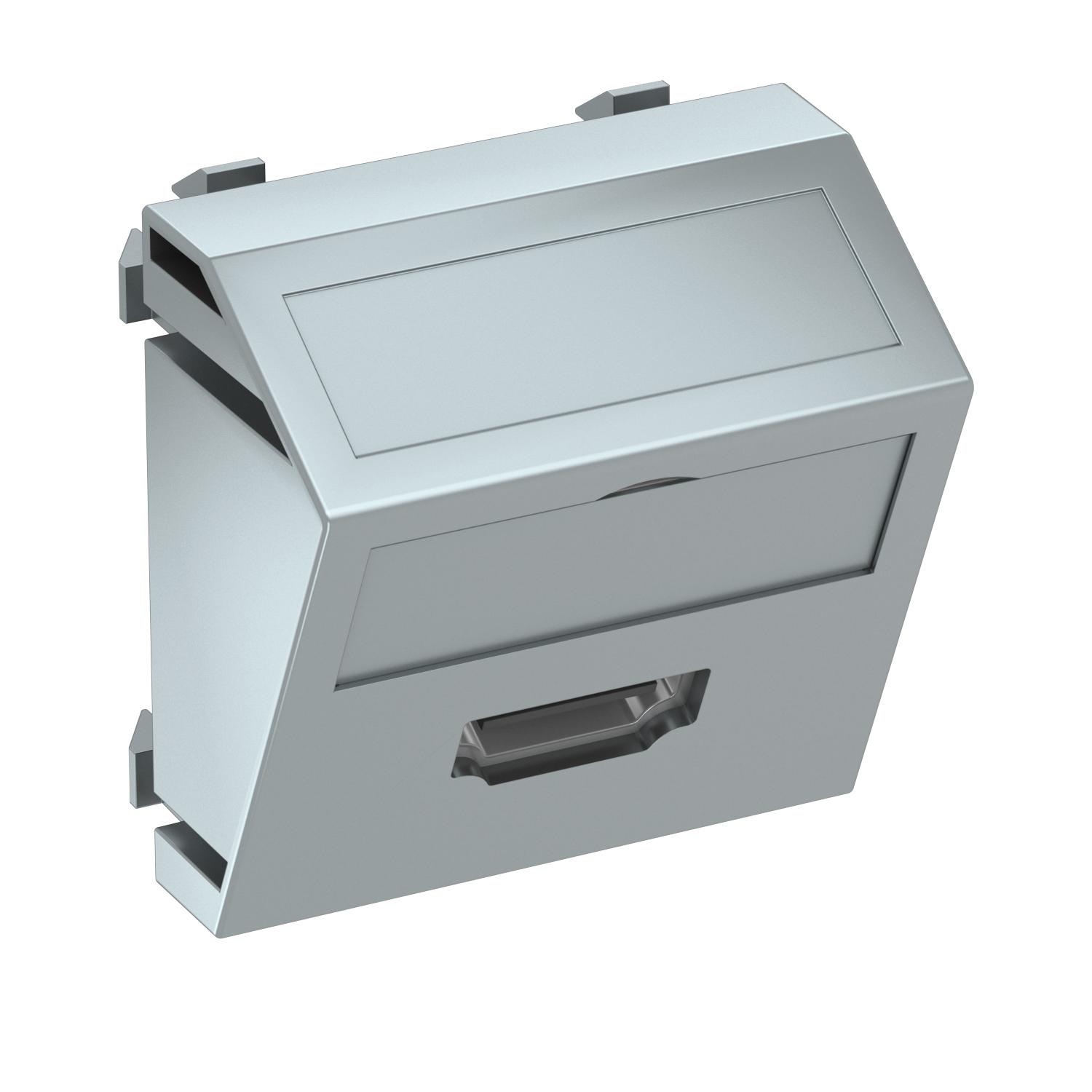 ProductbeschrijvingMultimediadrager met een HDMI-aansluitbus, schuine kabeluitlaat, met tekstveld, HDMI-bus met schroefaansluiting. Draagplaat met klikbevestiging, geschikt voor horizontale en verticale inbouw in de systeemomgeving.