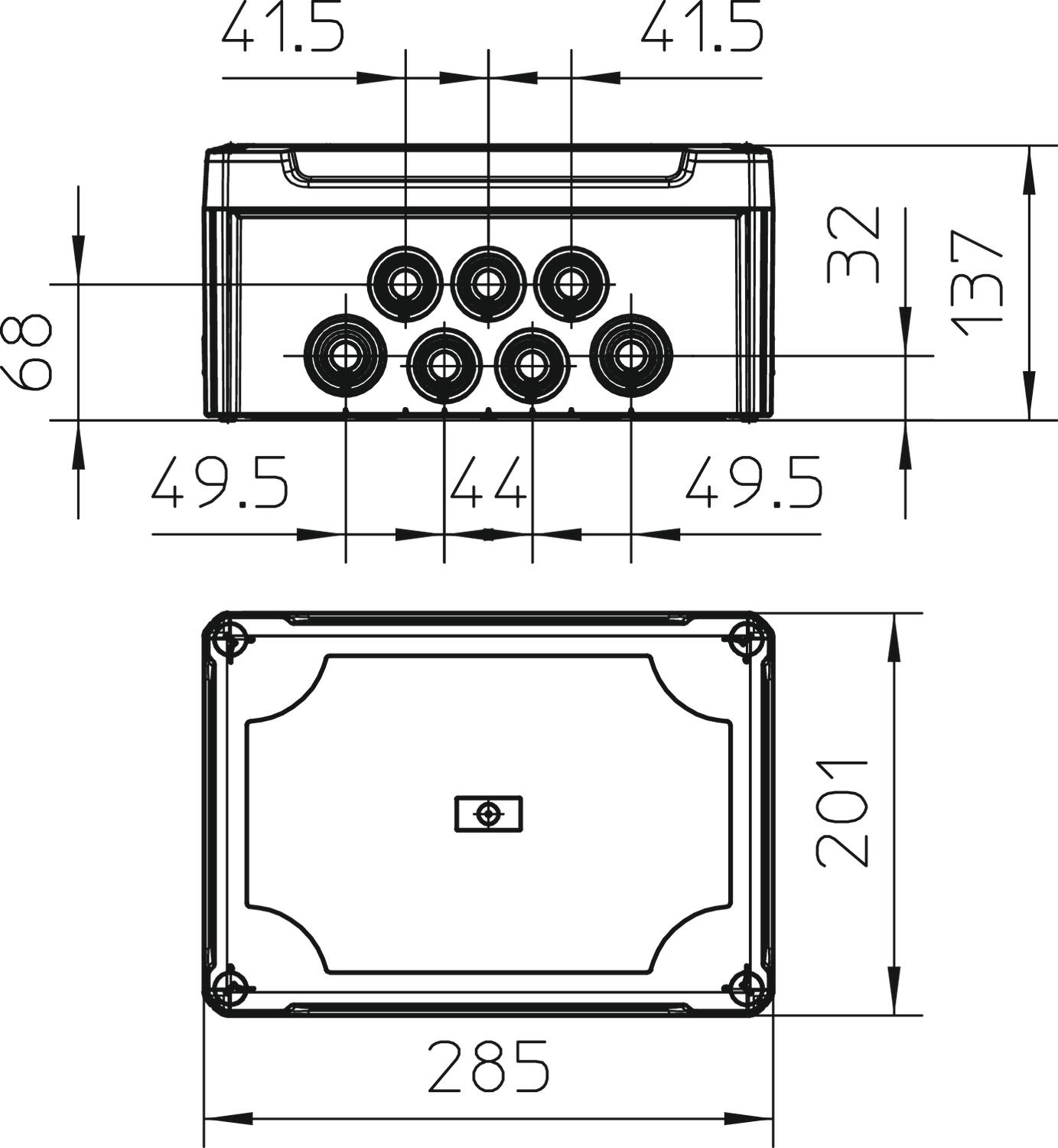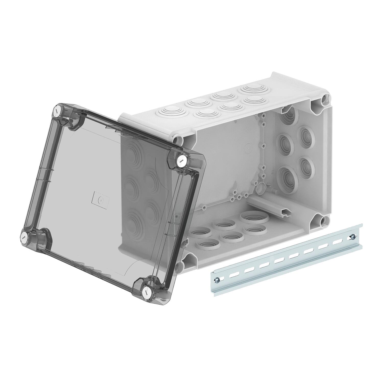 ProductbeschrijvingKabeldoos voor verbinden van kabels en leidingen in binnenopstelling en beschermde buitenopstelling. Rechthoekige vorm met kabelinvoeren. Geschikt voor wand-/plafondmontage en montage op montageplaten en schroefdraad in de bodem. Met de mogelijkheid tot binnenbevestiging en montage via het hoekelement. Hoog, transparant deksel met snelsluiting, verzegelbaar. Gefabriceerd van halogeenvrij en UV-bestendig materiaal. Inclusief DIN-rail.