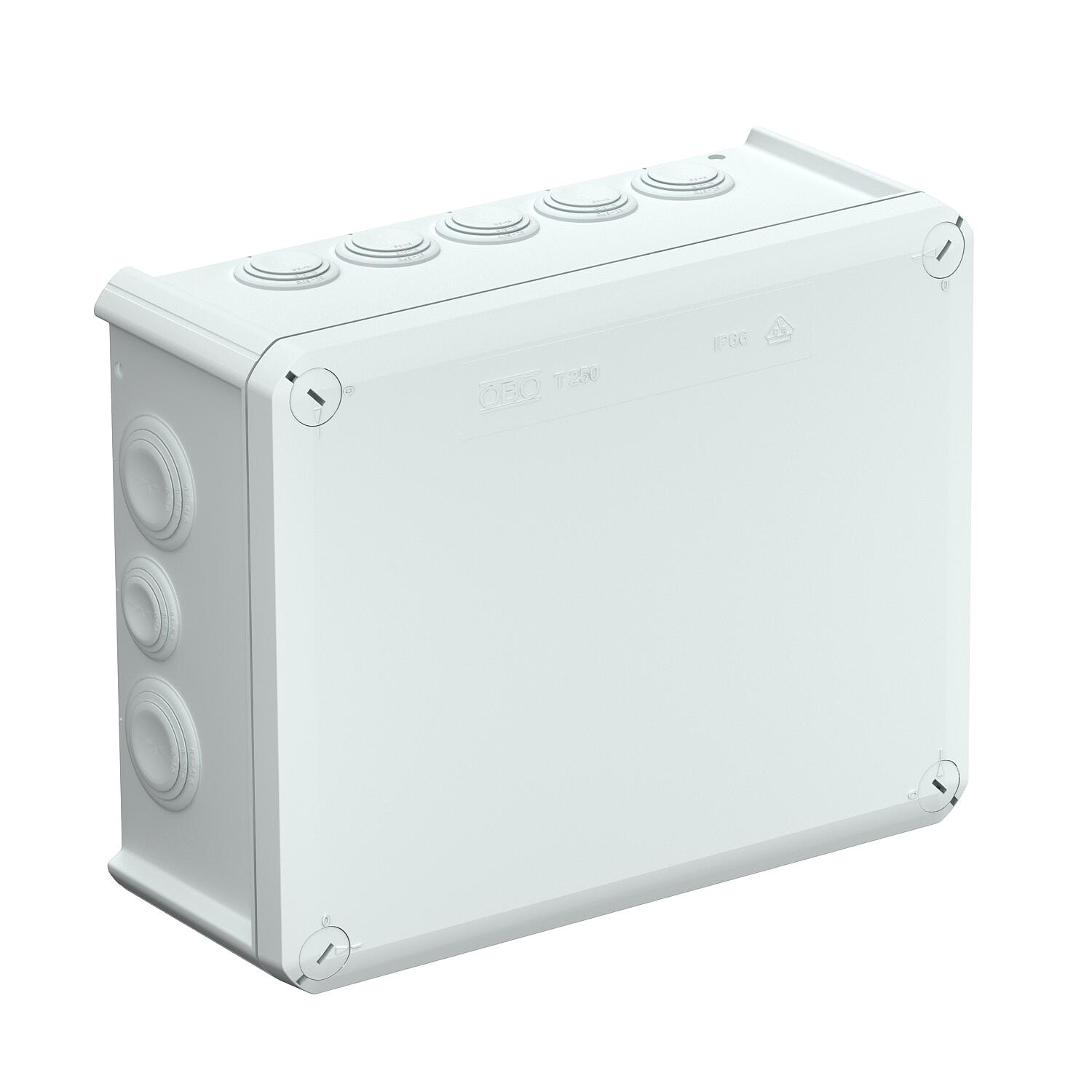 ProductbeschrijvingKabeldoos voor verbinden van kabels en leidingen in binnenopstelling en beschermde buitenopstelling. Rechthoekige vorm met kabelinvoeren aan de zijkanten en doorbreekinvoeren in de bodem. Geschikt voor wand-/plafondmontage en montage op montageplaten en schroefdraad in de bodem. Met de mogelijkheid tot binnenbevestiging en montage via het hoekelement. Deksel met snelsluiting, verzegelbaar. Gefabriceerd van halogeenvrij materiaal. Brandwerende uitvoering van speciaal polypropyleen.