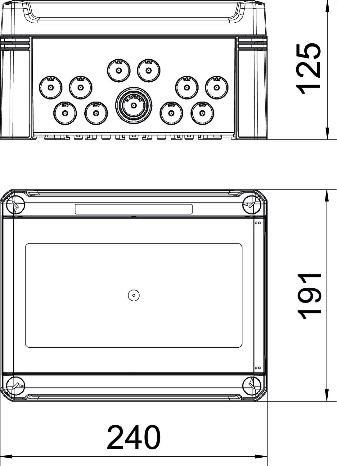 Opbouwminiverdeler, veiligheidsgeïsoleerd voor maximaal 9 deeleenheden. Aan de bovenzijde en onderzijde telkens 9 uitbreekopeningen (8x Ø20 en 1x Ø20/25/32) incl. voorgemonteerde 35 mm DIN-rail. De vier meegeleverde schroefafdekdoppen voorkomen een ongewilde "spanningsoverspraak".