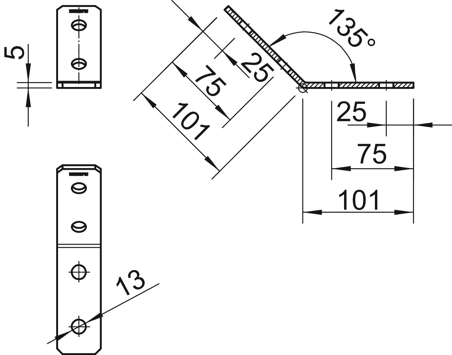 ProductbeschrijvingMontagehoek met 4 gaten voor verbinding van montagerails 41 x 41 mm en 41 x 21 mm onder een hoek van 45°.