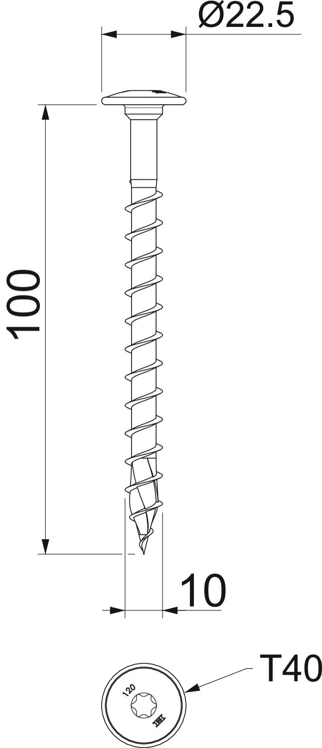 Dimensie 10x100 Dubbele schroefdraad nee Gehard ja Kleur zink Kopdiameter 22,5 mm Kopvorm Schotelkop Lengte 100 mm Maat D 10 mm Maat L 100 mm Materiaal Staal Oppervlak galvanisch verzinkt Schachtdiameter 7 mm Schroefsysteem Torx - Alle typen