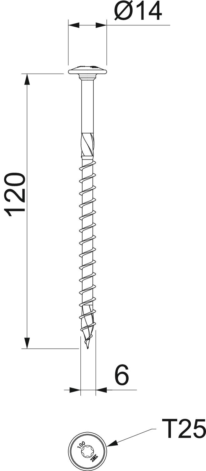 Dimensie 6x120 Dubbele schroefdraad nee Gehard ja Kleur zink Kopdiameter 14 mm Kopvorm Schotelkop Lengte 120 mm Maat D 6 mm Maat L 120 mm Materiaal Staal Oppervlak galvanisch verzinkt Schachtdiameter 4,5 mm Schroefsysteem Torx - Alle typen