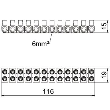 Aansluitbare aderdiameter massief max. 6 mm² Aansluitbare aderdiameter massief min. 1,5 mm² Aansluitbare aderdiameter soepel zonder andereindhuls max. 4 mm² Aansluitbare aderdiameter soepel zonder andereindhuls min. 1,5 mm² Aansluitpositie zijdelings Aantal klemmen 12 Aantal klemmen per pool 2 Aantal polen 12 Afsluitplaat noodzakelijk nee Boorgatafstand centrisch 10 mm Breedte 18,9 mm Dimensie 6mm² Doorsnede Max. connections per side: 6 mm² rigid or 4 mm² flexible mm² Explosieveilige uitvoering nee Geschikt voor flexibele ader ja Geschikt voor massieve ader ja Geschikt voor meeraderige geleiders ja Hoogte 14,9 mm Kleur wit Lengte 116,5 mm Materiaal Polypropyleen Nominale spanning 450 V Omgevingstemperatuur 80 °C Temperatuurbereik max. 80 °C Temperatuurbereik min. -5 °C Transparant nee Uitvoering elektrische aansluiting 1 Schroefaansluiting Uitvoering elektrische aansluiting 2 Schroefaansluiting - Alle typen