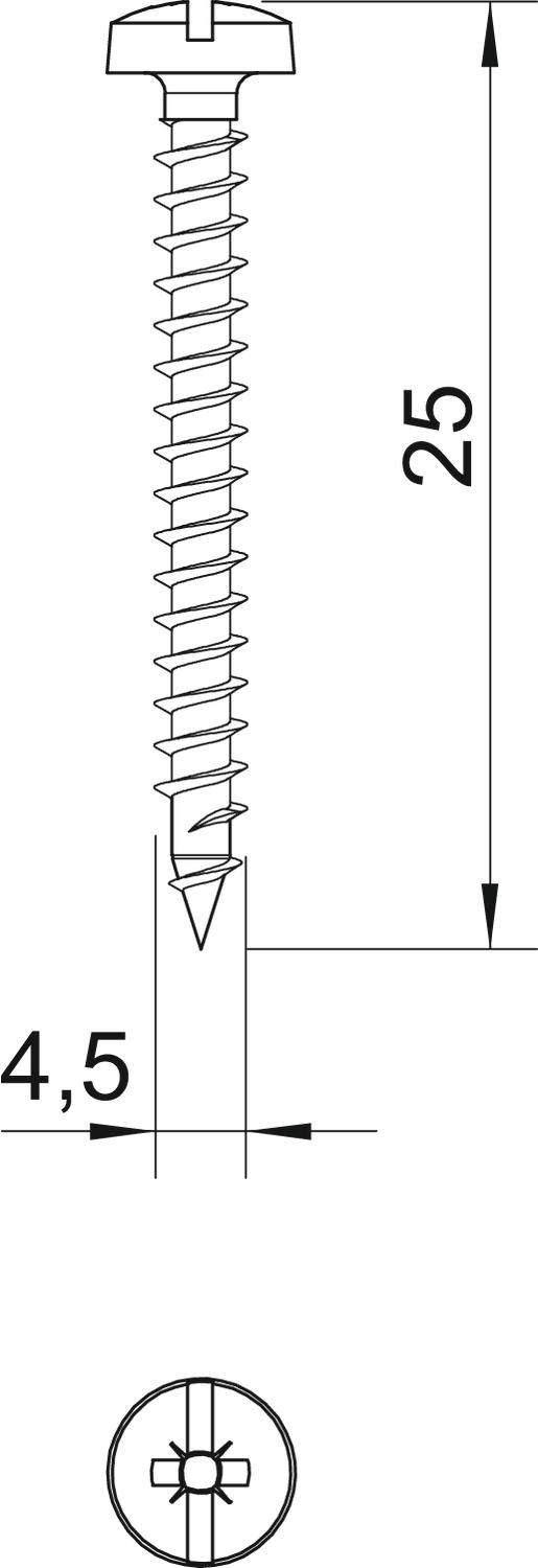 Dimensie 4,5x25mm Dubbele schroefdraad ja Gehard ja Kopdiameter 8,2 mm Kopvorm Panhead Lengte 25 mm Maat D 4,5 mm Maat L 25 mm Materiaal Staal Oppervlak galvanisch verzinkt Schroefsysteem combislot Stijfsel 4,5 mm - Alle typen