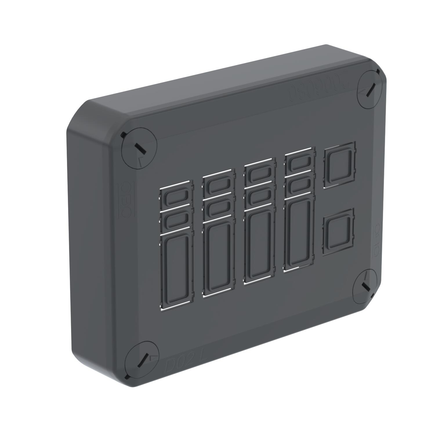 Stekerbare deksel voor afsluiten van kabeldozen, uitgerust met uitbreekpoorten voor meerpolige insteeksystemen of DATA-systemen op Keystone-basis. Met snelsluiting in deksel, verzegelbaar. Halogeenvrij materiaal, UV-resistent. Moeilijk ontvlambaar volgens NEN-EN-IEC 60695-2-11, testtemperatuur 650 °C. Slagvastheid IK07 bij kamertemperatuur. Beschermingsgraad IP30.