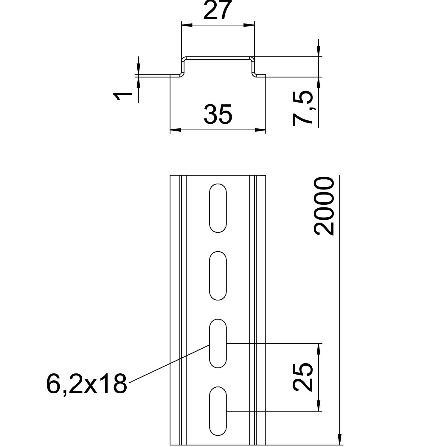 Boorgatafstand centrisch 25 mm Breedte 35 mm Bundel 50 m Dimensie 2000x35x7,5 Gatvorm (ETIM) Sleufgat Hoogte 7,5 mm Kleur zink Lengte 2000 mm Materiaal Staal Materiaaldikte 1 mm Oppervlak galvanisch verzinkt, transparant gepassiveerd Uitvoering perforated Uitvoering rails Draagrail DIN EN 60715 - Alle typen