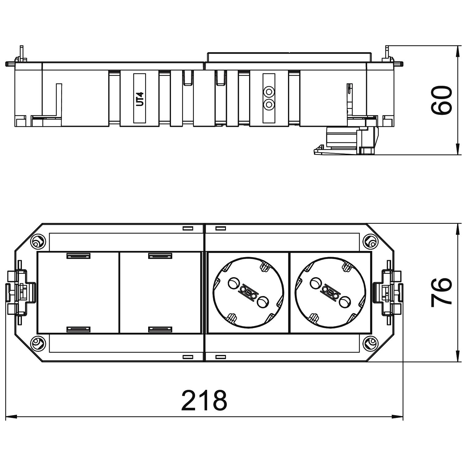 ProductbeschrijvingDe aansluitgerede universele drager UTC4 beschikt over twee voorgeïnstalleerde 33° veiligheidscontactdozen met 16 A en twee blindafdekkingen voor inbouw naderhand van twee installatie-apparaten uit de serie Module 45 of Module 45connect Passend bij de verbindingskabels VL en de inbouweenheden met nominale grootte R7, R9 en 9.