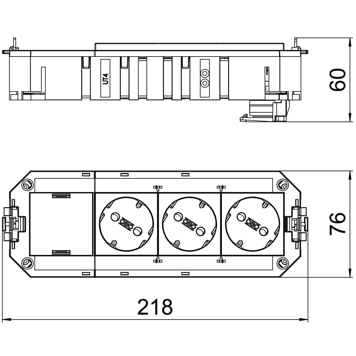 ProductbeschrijvingDe aansluitgerede universele drager UTC4 beschikt over drie voorgeïnstalleerde 33° veiligheidscontactdozen met 16 A en een blindafdekking voor inbouw naderhand van een installatie-apparaat uit de serie Module 45 of Module 45connect Passend bij de verbindingskabels VL en de inbouweenheden met nominale grootte R7, R9 en 9.