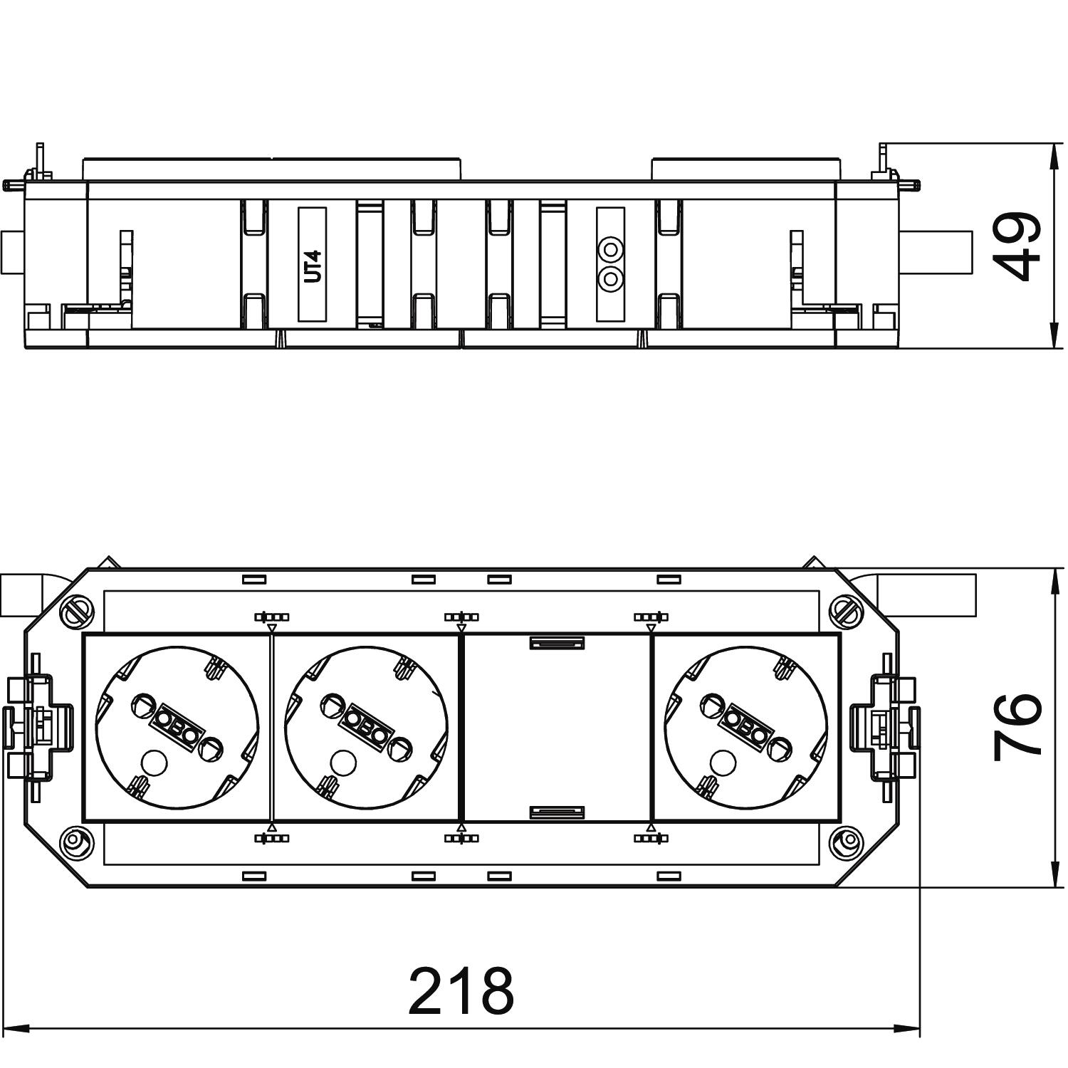 De aansluitgerede universele drager UTC4 beschikt over 2 voorgeïnstalleerde 33° contactdozen met randaarde in oranje, een voorgeïnstalleerde 33° contactdoos met randaarde in groen en een blindafdekking voor inbouw achterafvan een installatie-apparaat uit de serie Module 45 of Module 45connect, 250 V~ 16 A.