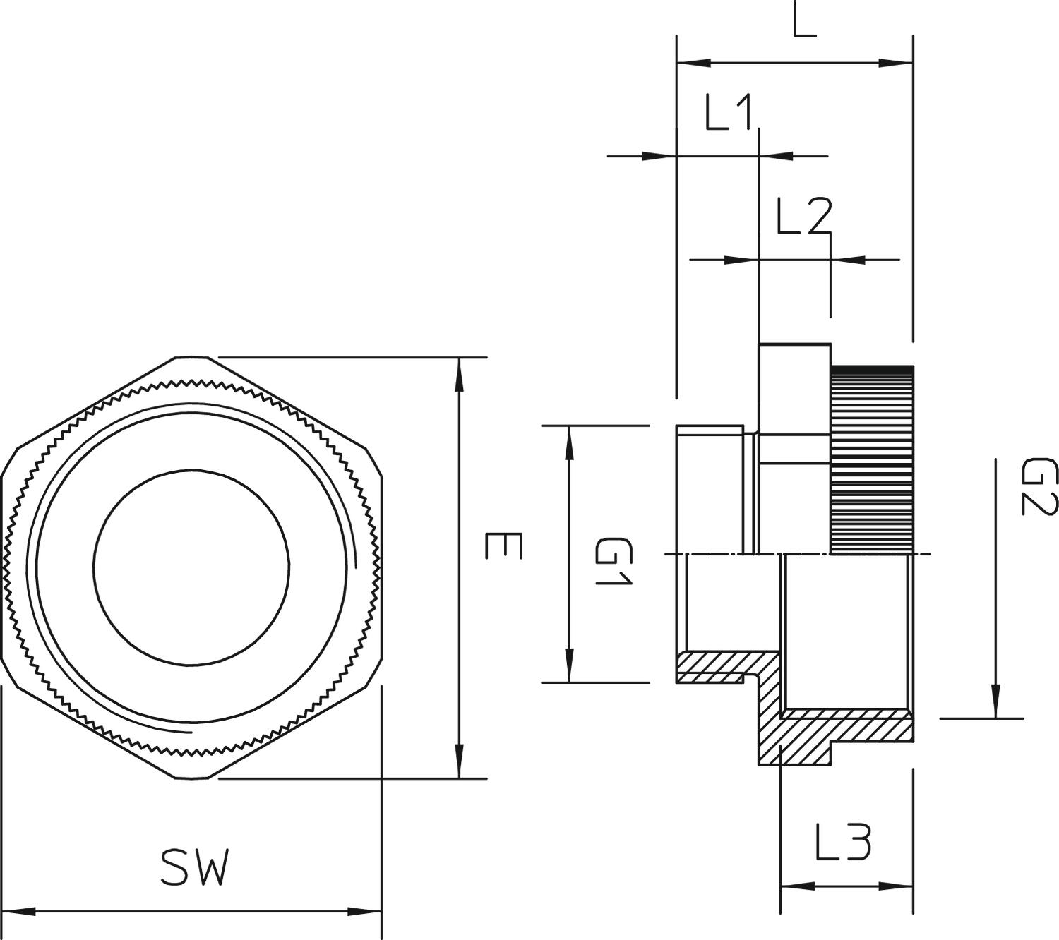 ProductbeschrijvingUitbreiding van messing met metrisch binnen- en buitendraad voor de montage van kunststof kabelwartels op behuizingen. Beschermingsklassen IP54 zonder extra aansluitafdichting. Beschermingsklasse tot IP68 mogelijk met extra aansluitafdichting, bijvoorbeeld O-ring of vlakke afdichtring.