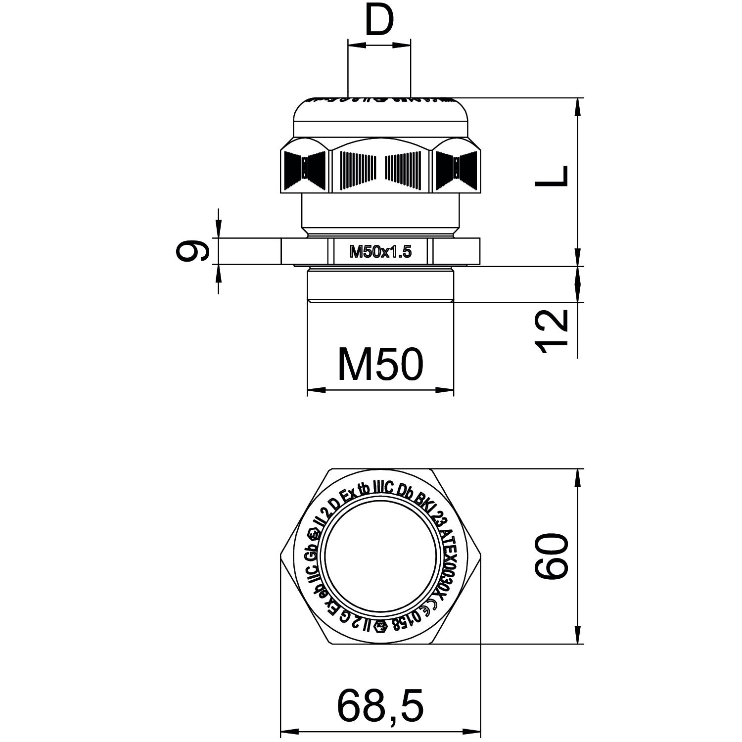Afdichtbereik D max. 38 mm Afdichtbereik D min. 32 mm Afmeting e 68,5 mm Afmeting G M50 mm Afmeting L max. 57 mm Afmeting L min. 42 mm Beschermingsgraad IP68 CO2-voetafdruk (GWP) van wieg tot poort 0,4032 kg CO2e / 1 Stuk Deelbare wartel nee Dimensie M50 Doorbuigbescherming nee Explosiebeveiligd ja Glasvezelversterkt nee Halogeenvrij ja Instabiel draaimoment 17 Nm Kleur zwart Lengte schroefdraad 13 mm Maat L1 13 mm Maat L2 9 mm Materiaal Polyamide Meervoudig dichtingsinzetstuk nee Met borgmoer nee Nominale schroefdraadmaat 50 Schroefdraad M50 x 1,5 Slagvast nee Sleutelwijdte 60 Soort afdichting Dichtring Soort schroefdraad Metrisch Spoed 1,5 mm Temperatuurbereik max. 65 °C Temperatuurbereik min. -20 °C Trekontlastingsmogelijkheid nee Uitvoering Recht Voor Ex-zone ja voor Ex-zone gas 1, 2 voor Ex-zone stof 21, 22 Wartel voor platte kabel nee Zeskant hoekmaat 68,5 mm - Alle typen