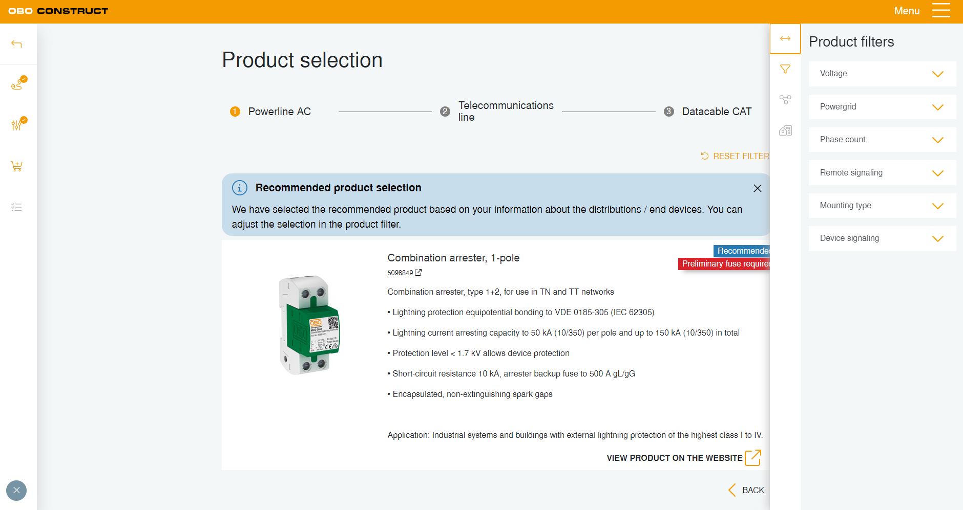 Deze online-tool ondersteunt u bij het kiezen en aansluiten van passende overspanningsbeveiligingssystemen voor uw individuele project en informeert u over de OBO overspanningsbeveiligingssystemen. U kunt snel, efficiënt en doelgericht uw persoonlijke materiaallijst, aansluitschema en aanbestedingstekst voor de complete overspanningsbeveiliging op de gebieden energietechniek, fotovoltaica, telecommunicatie, MSR, TV, HF en datatechniek aanmaken en deze voor verdere bewerking exporteren naar Excel-formaat.
